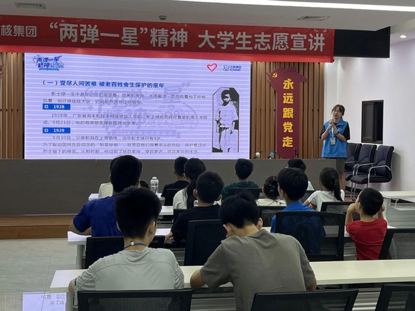 在建军97周年来临之际,公司“核星”聚力宣讲团于7月31日上午走进狼山街道园林社区,开展“强国有我,星耀东方”——“两弹一星”精神宣讲,为社区的青少年介绍伟大的“两弹一星”精神。公司党委副书记、副经理周春娟,团委书记赵鹏,园林社区党群服务中心张小佳主任、团队指导教师易承东现场观摩并指导宣讲。