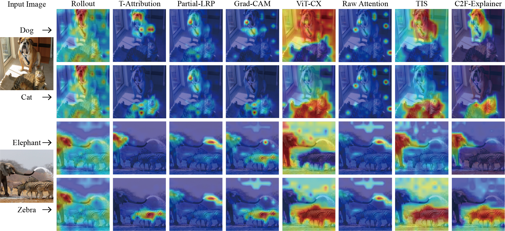 Fig. 3. Comparison of interpretation results on the multi-category natural images. For each image, the interpretation results for two different categories are presented