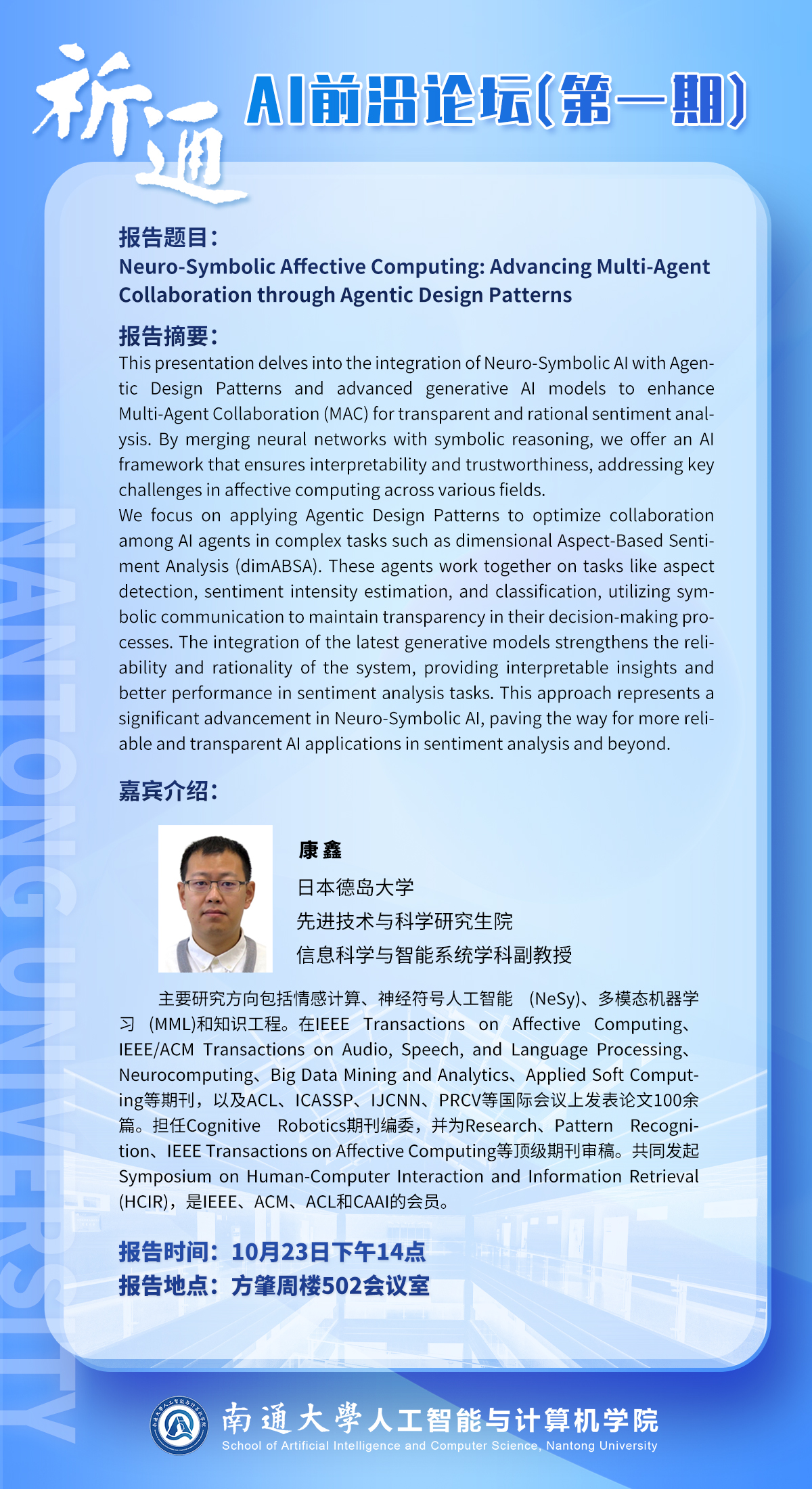 讲座预告 | Neuro-Symbolic Affective Computing: Advancing Multi-Agent Collaboration through Agentic Design Patterns