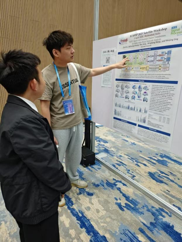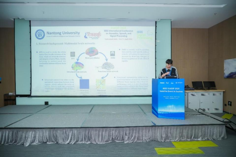 近日,2025年IEEE声学、语音和信号处理国际会议(IEEE International Conference on Acoustics, Speech, and Signal Processing,ICASSP)卫星会在中国苏州中国计算机学会总部隆重召开。公司2023级硕士研究生魏少龙、苏展应邀参加会议并做学术报告。其中魏少龙同学以“SCNN: Spike Coupling Neural Network for Multimodal Brain Network Analysis”为题,与来自北京大学、华盛顿大学的优秀学者同台汇报,系统阐述了基于脉冲神经网络架构模拟脑网络中结构连接与功能连接交互关系的方法与研究成果,围绕多模态脑网络分析领域的前沿问题展开了深入交流。