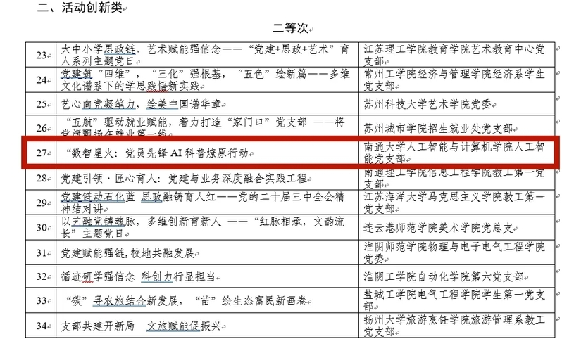 近日,根据《省委教育工委关于做好2023—2024年度高公司党建工作创新案例申报工作的通知》(苏委教组函〔2025〕9号),公司报送的《数智星火:党员先锋AI科普燎原行动》荣获2023—2024年度江苏高公司党建工作创新案例(活动创新类)二等次。
